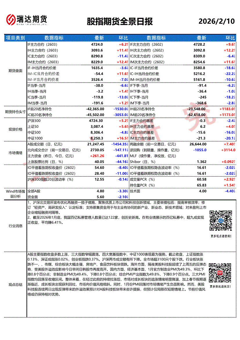 瑞达期货-股指期货全景日报-260210