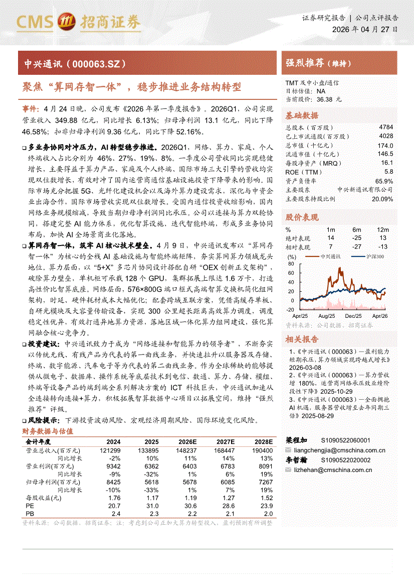 中兴通讯:招商证券-中兴通讯-000063-聚焦“算网存智一体”,稳步推进业务结构转型-260427
