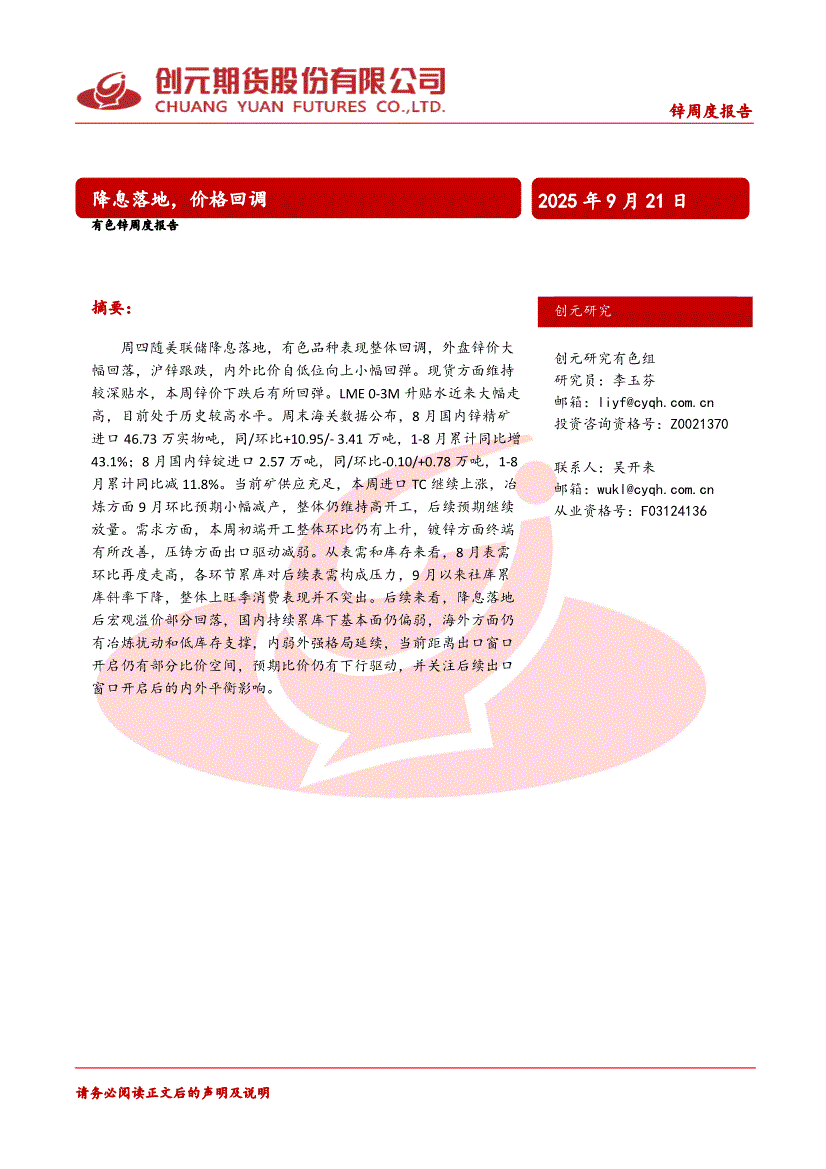 创元期货-有色锌周度报告:降息落地,价格回调-250921