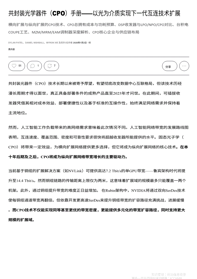 光学器件行业:SemiAnalysis-光学器件行业共封装光学器件(CPO)手册:以光为介质实现下一代互连技术扩展-260102