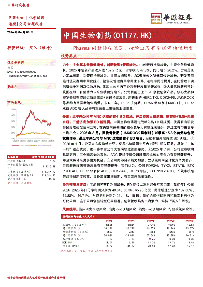 中国生物制药:华源证券-中国生物制药-1177.HK-Pharma创新转型显著,持续出海有望提供估值增量-260408