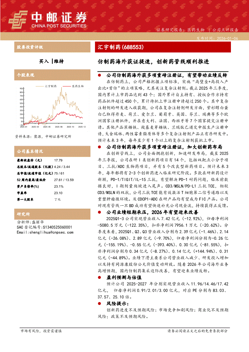汇宇制药:中邮证券-汇宇制药-688553-仿制药海外获证提速,创新药管线顺利推进-260106