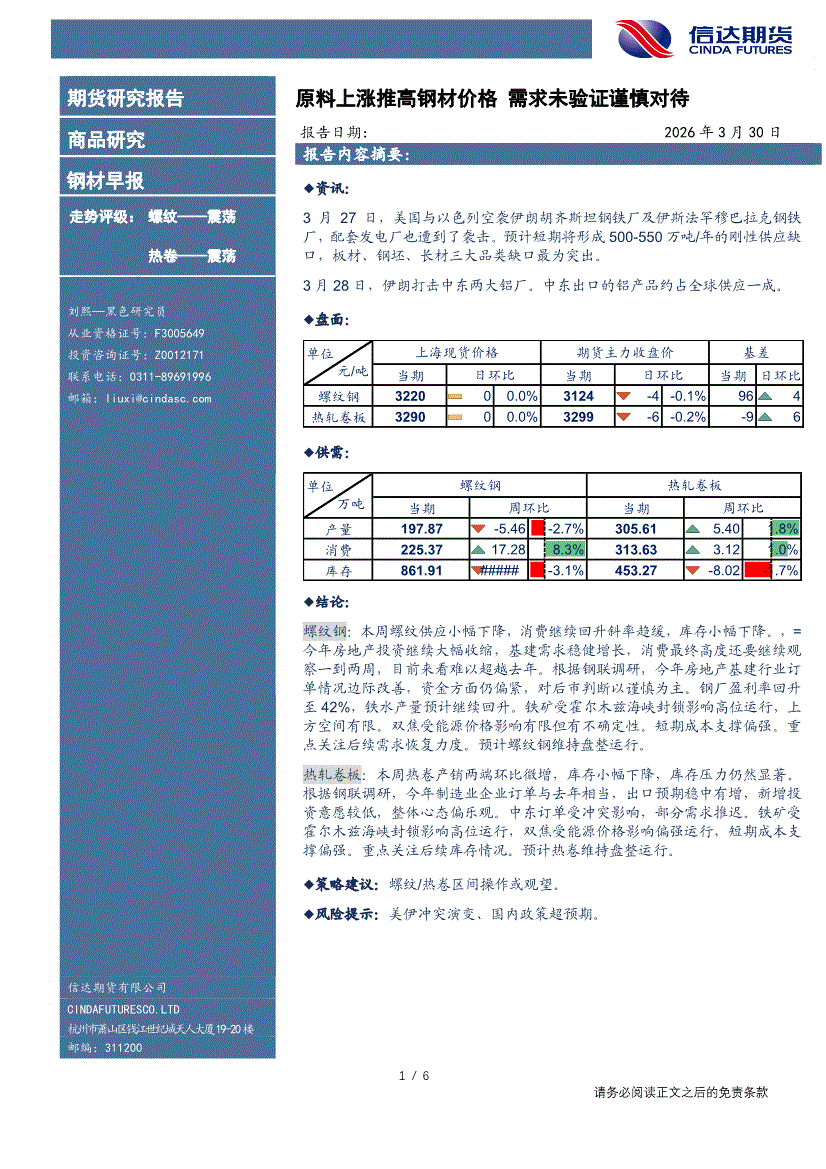 信达期货-钢材早报:原料上涨推高钢材价格,需求未验证谨慎对待-260330