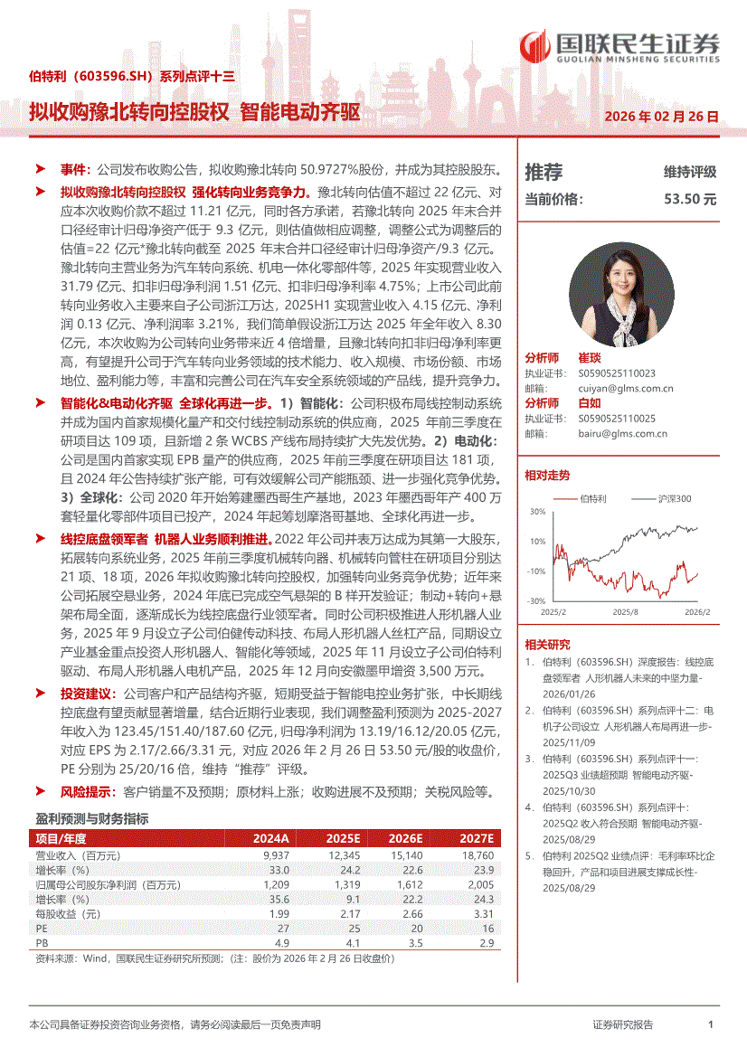 伯特利:国联民生证券-伯特利-603596-系列点评十三:拟收购豫北转向控股权,智能电动齐驱-260226