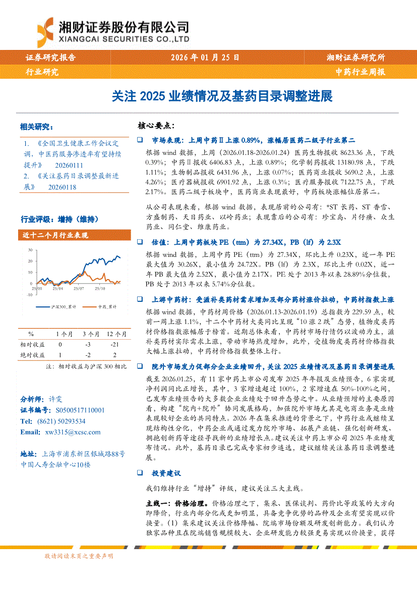 中药行业:湘财证券-中药行业周报:关注2025业绩情况及基药目录调整进展-260125