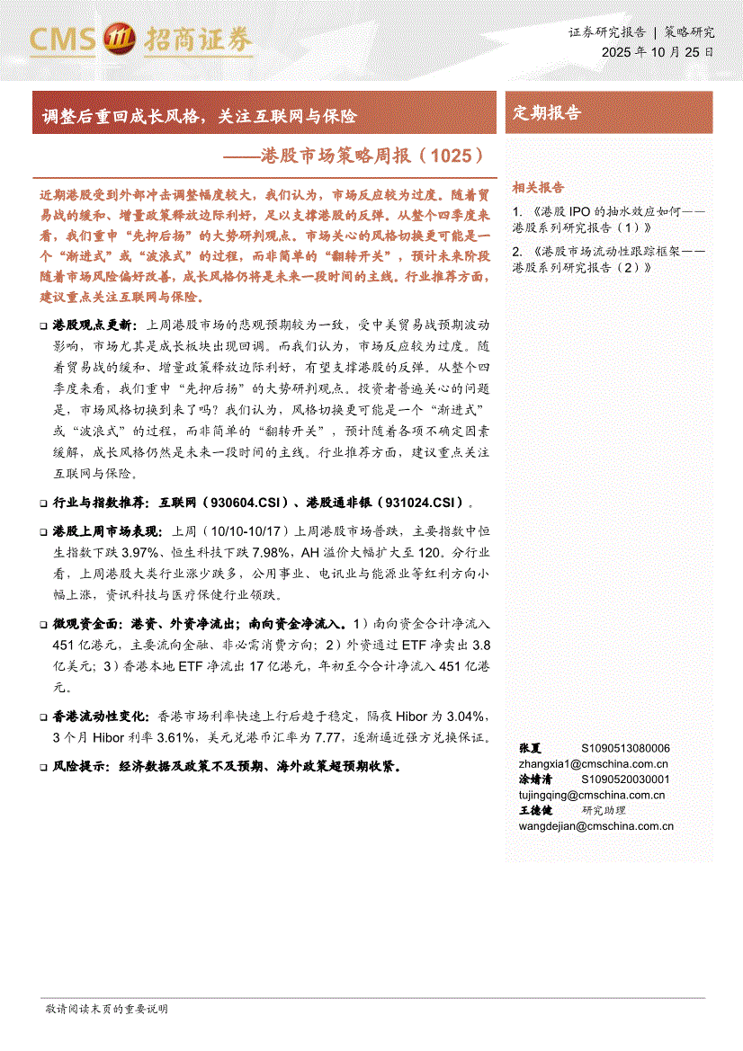 招商证券-港股市场策略周报:调整后重回成长风格,关注互联网与保险-251025