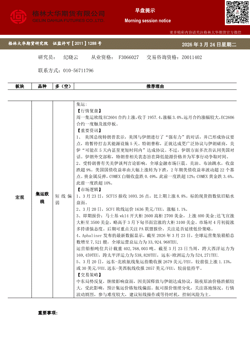 格林大华期货-早盘提示:集运欧线-260327