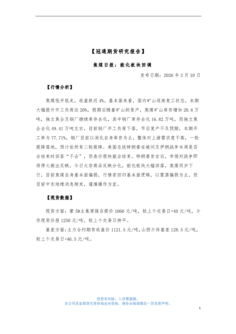 冠通期货-焦煤日报:能化板块回调-260310