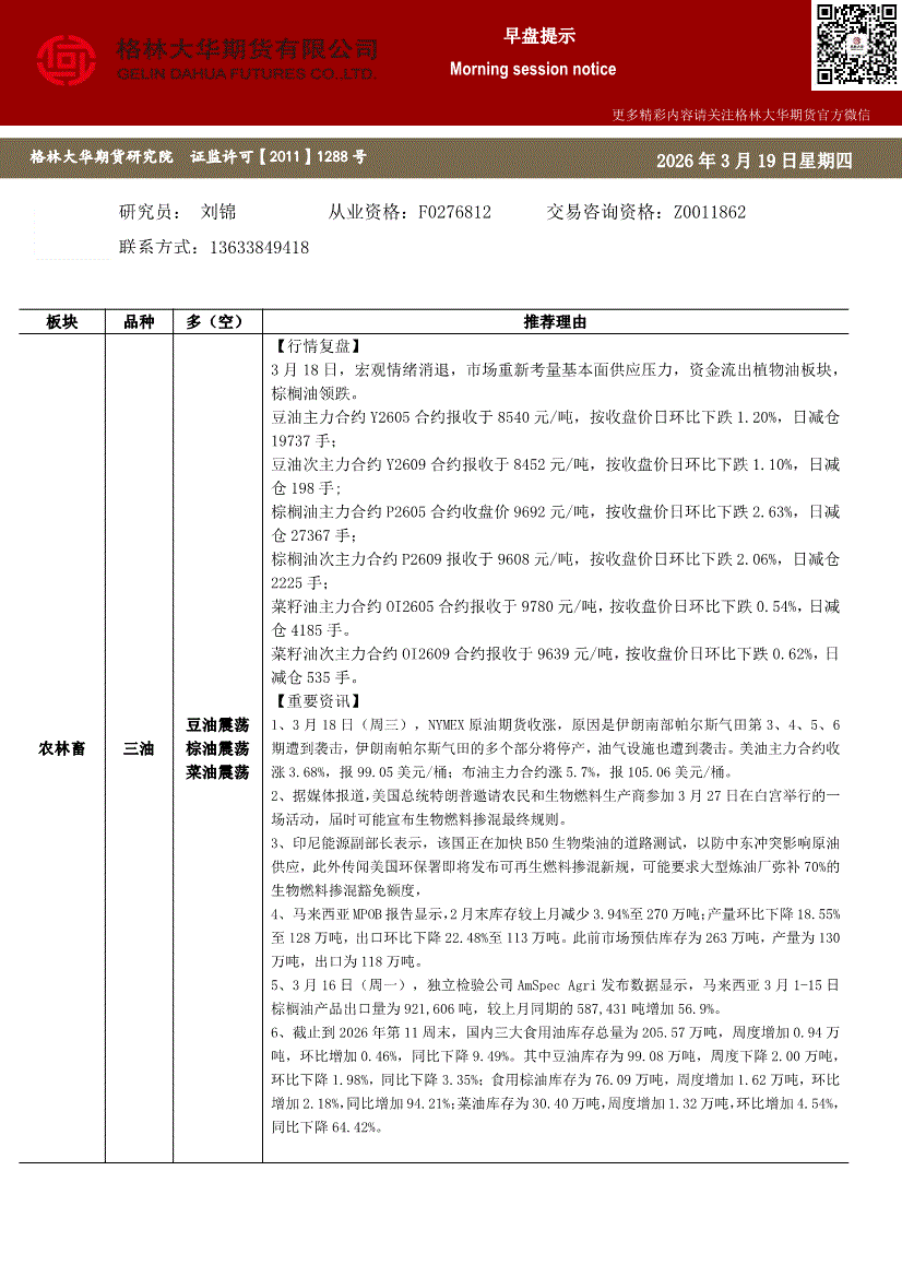 格林大华期货-早盘提示:三油两粕-260319