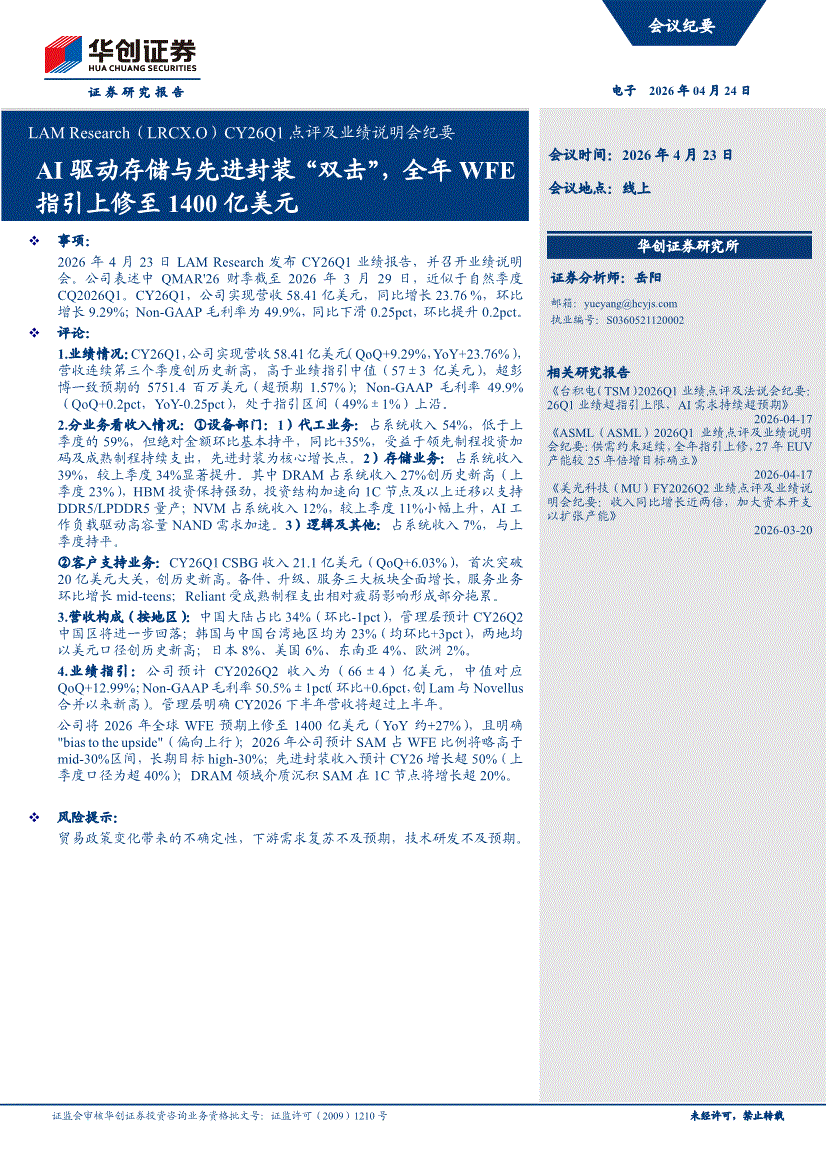 LAM Research:华创证券-LAM Research-LRCX.US-CY26Q1点评及业绩说明会纪要:AI驱动存储与先进封装“双击”,全年WFE指引上修至1400亿美元-260424