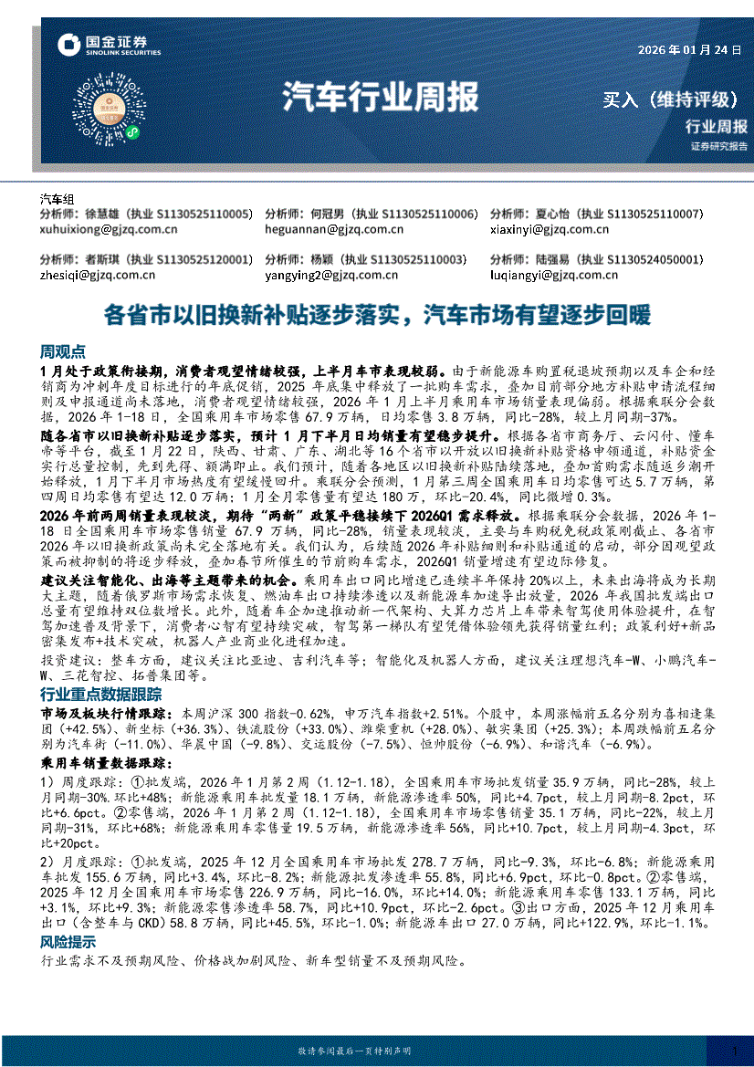 汽车行业:国金证券-汽车行业周报:各省市以旧换新补贴逐步落实,汽车市场有望逐步回暖-260124