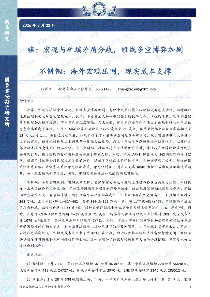 国泰君安期货-镍:宏观与矿端矛盾分歧,短线多空博弈加剧,不锈钢,海外宏观压制,现实成本支撑-260322