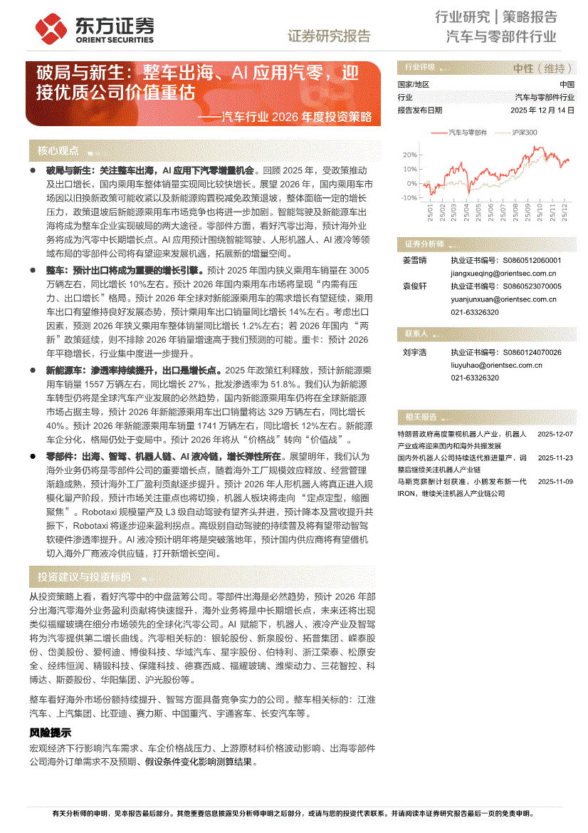 汽车行业:东方证券-汽车行业2026年度投资策略:破局与新生,整车出海、AI应用汽零,迎接优质公司价值重估-251214