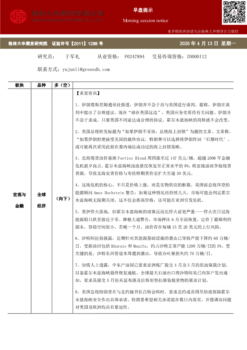 格林大华期货-大类资产周报:美式和平不可信-260417