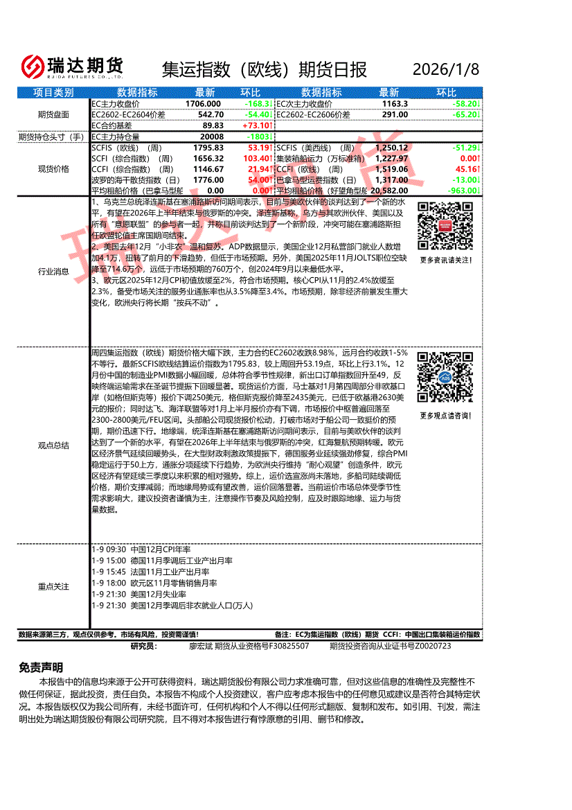 瑞达期货-集运指数(欧线)期货日报-260108