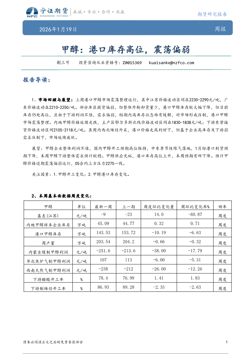 宁证期货-甲醇周报:港口库存高位,震荡偏弱-260119