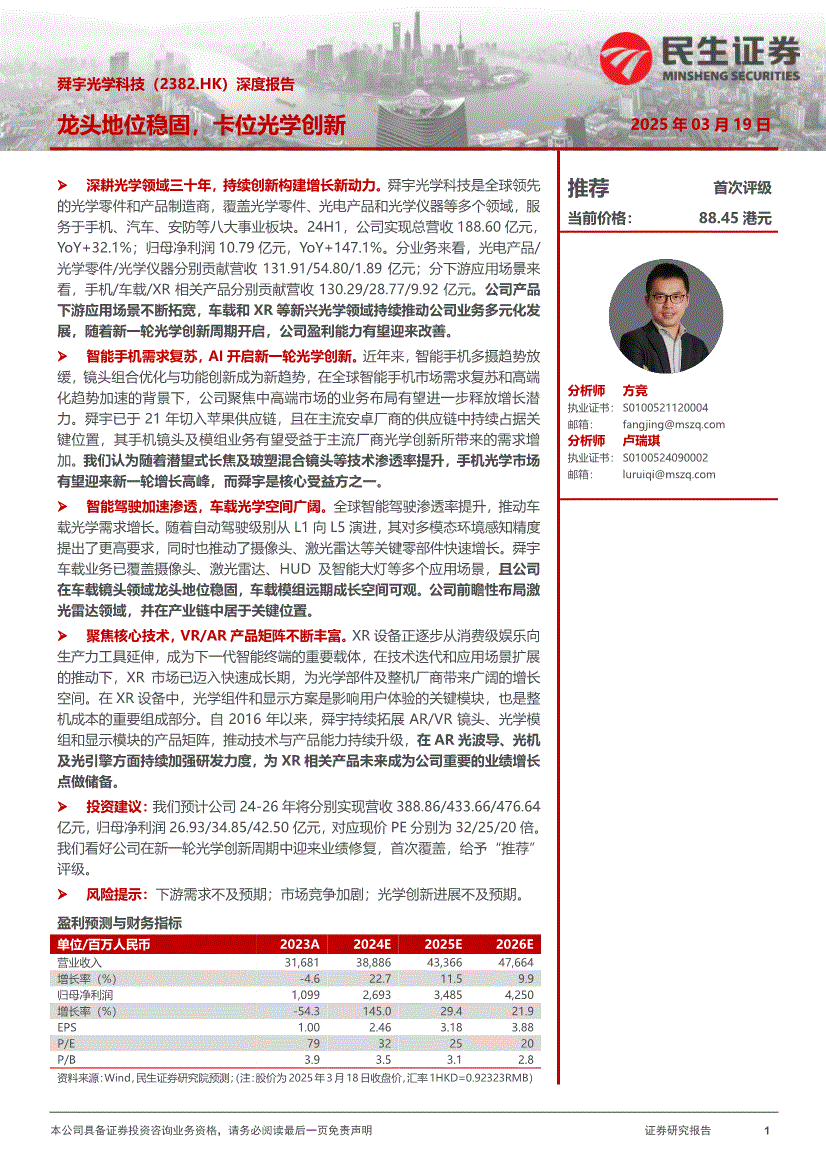 舜宇光学科技:民生证券-舜宇光学科技-2382.HK-深度报告:龙头地位稳固,卡位光学创新-250319