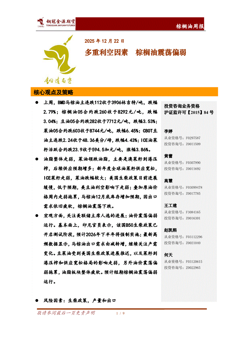 铜冠金源期货-棕榈油周报:多重利空因素,棕榈油震荡偏弱-251222