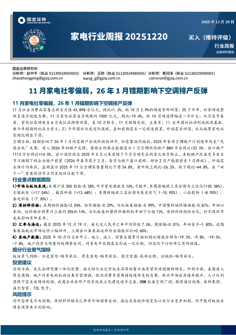 家电行业:国金证券-家电行业周报:11月家电社零偏弱,26年1月错期影响下空调排产反弹-251220