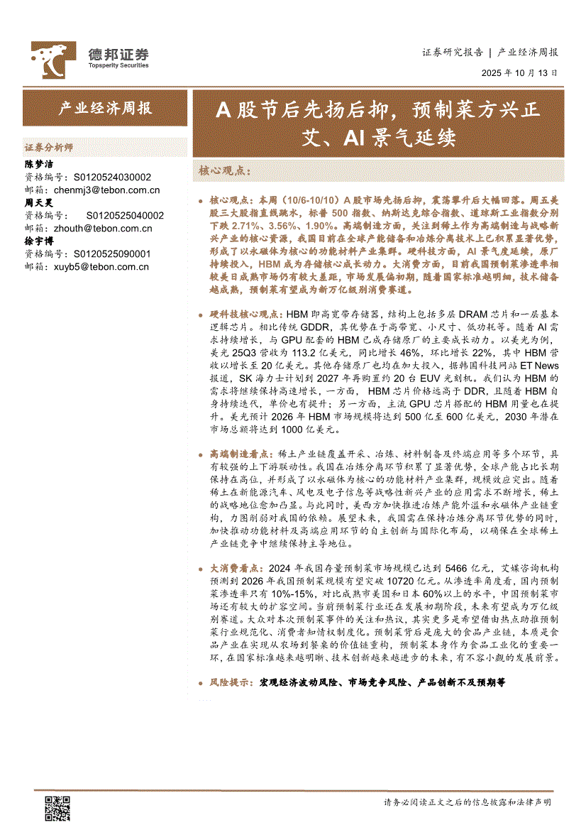德邦证券-产业经济周报:A股节后先扬后抑,预制菜方兴正艾、AI景气延续-251013