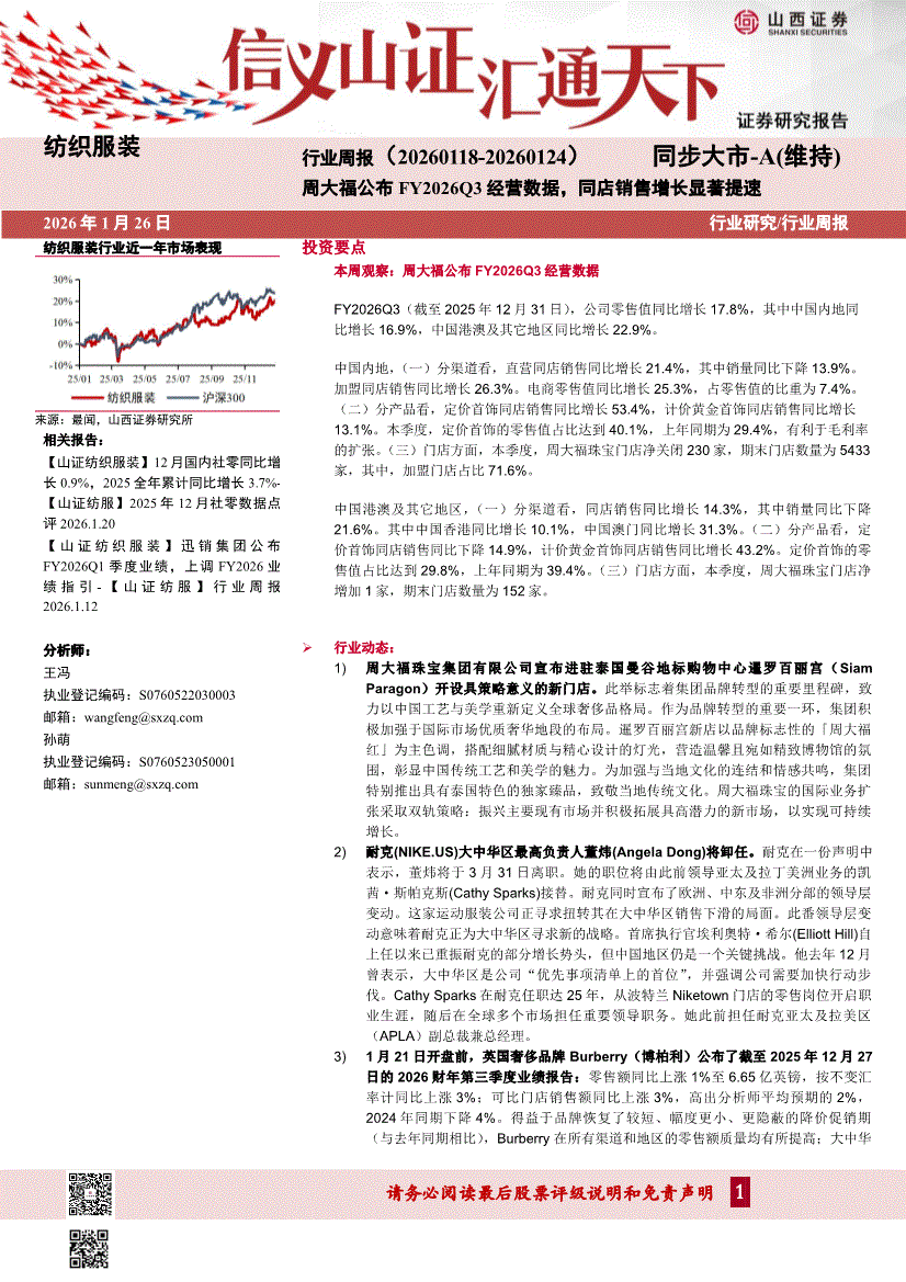 纺织服装行业:山西证券-纺织服装行业周报:周大福公布FY2026Q3经营数据,同店销售增长显著提速-260126
