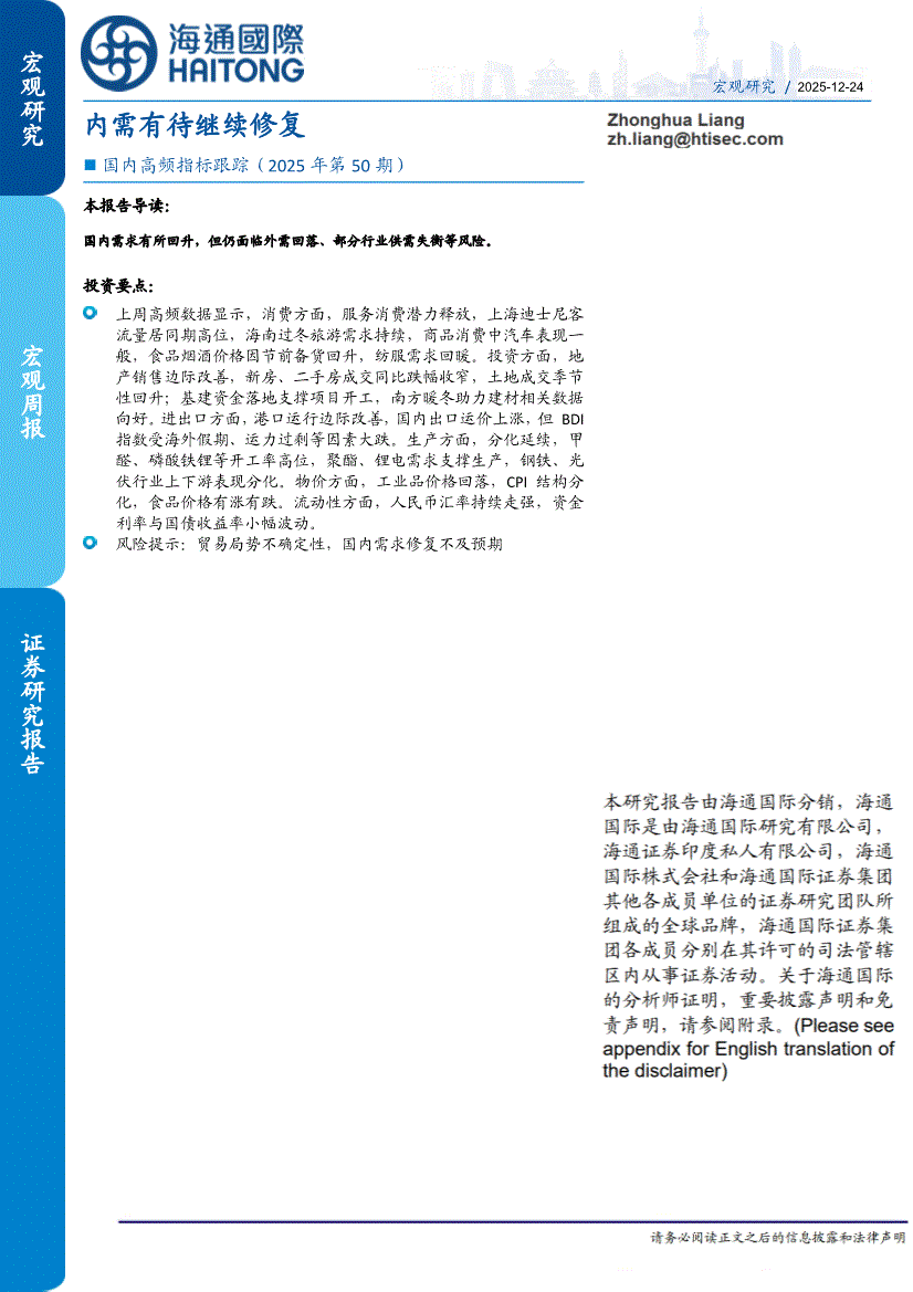 海通国际-国内高频指标跟踪(2025年第50期):内需有待继续修复-251224