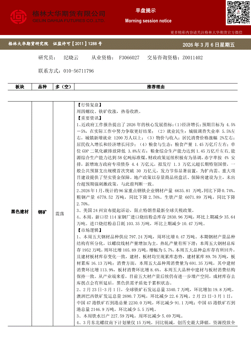 格林大华期货-早盘提示:钢矿-260306