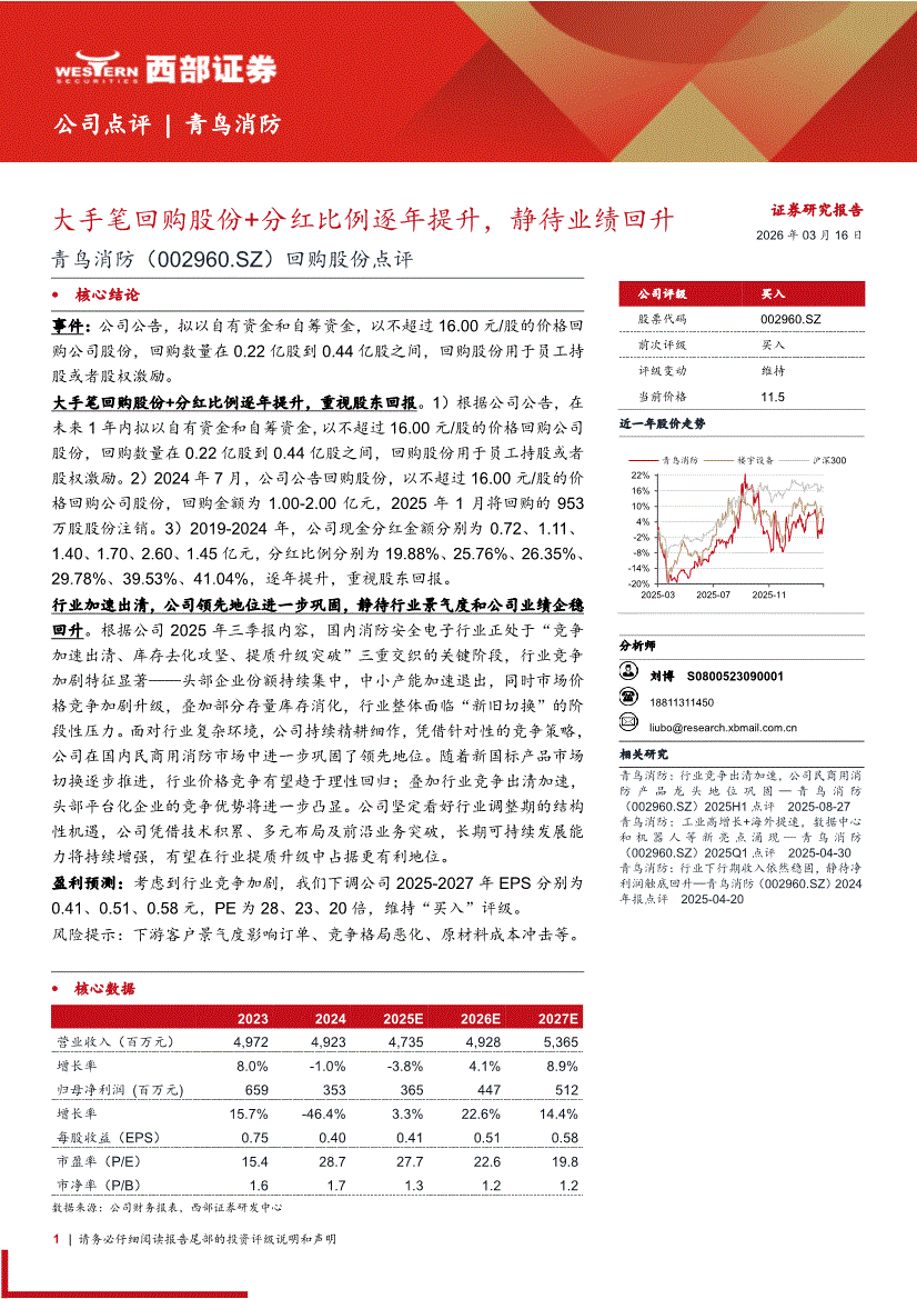 青鸟消防:西部证券-青鸟消防-002960-回购股份点评:大手笔回购股份+分红比例逐年提升,静待业绩回升-260316