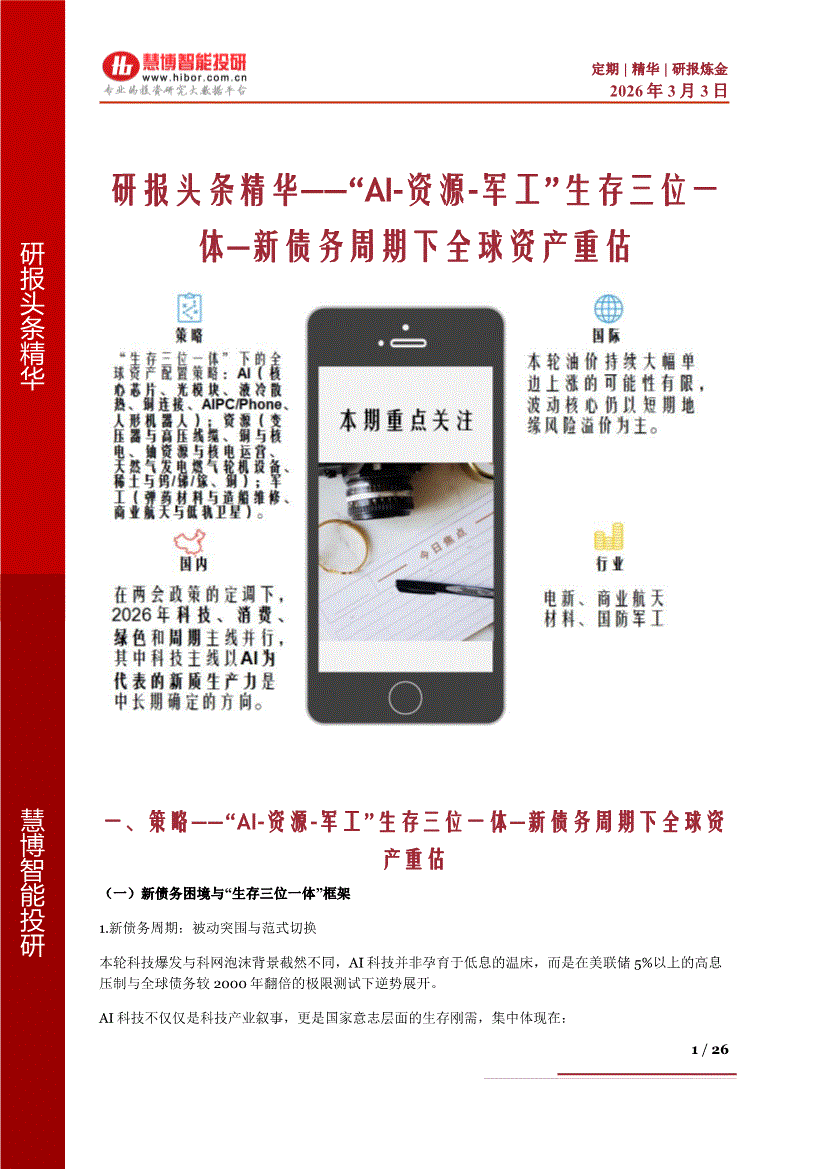 慧博智能投研-慧博研报炼金之研报头条精华:“AI~资源~军工”生存三位一体—新债务周期下全球资产重估-260303