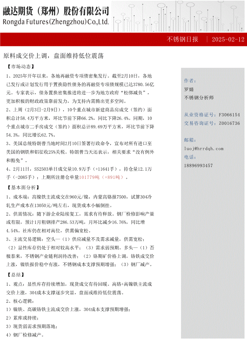 融达期货(郑州)-不锈钢日报:原料成交价上调,盘面维持低位震荡-250212