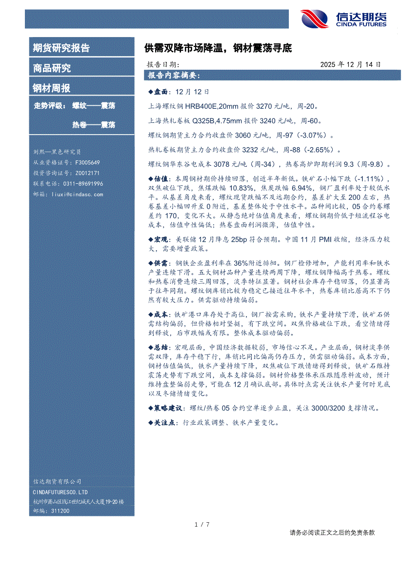 信达期货-钢材周报:供需双降市场降温,钢材震荡寻底-251214