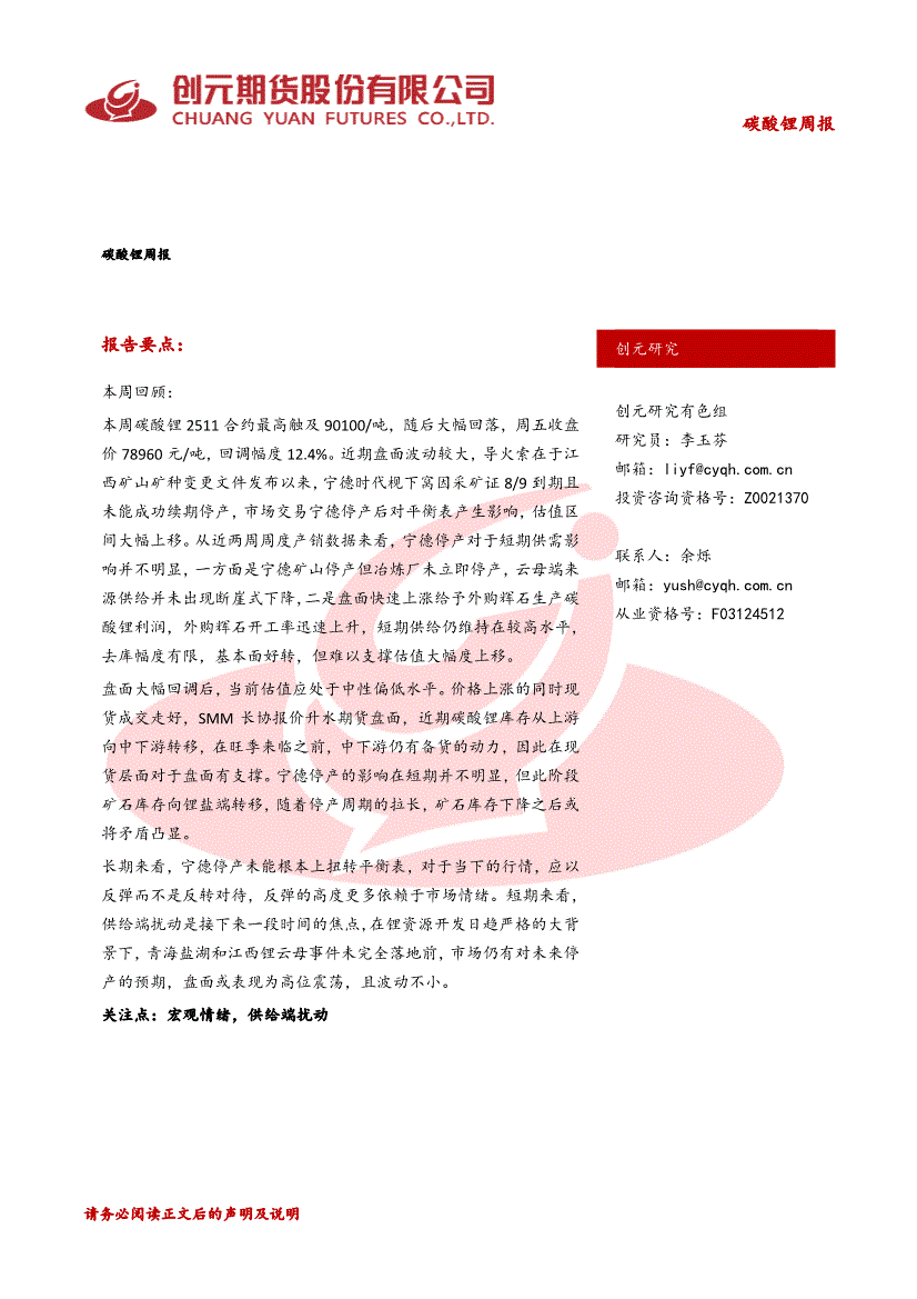 创元期货-碳酸锂周报:盘面大幅波动,关注下方支撑-250824