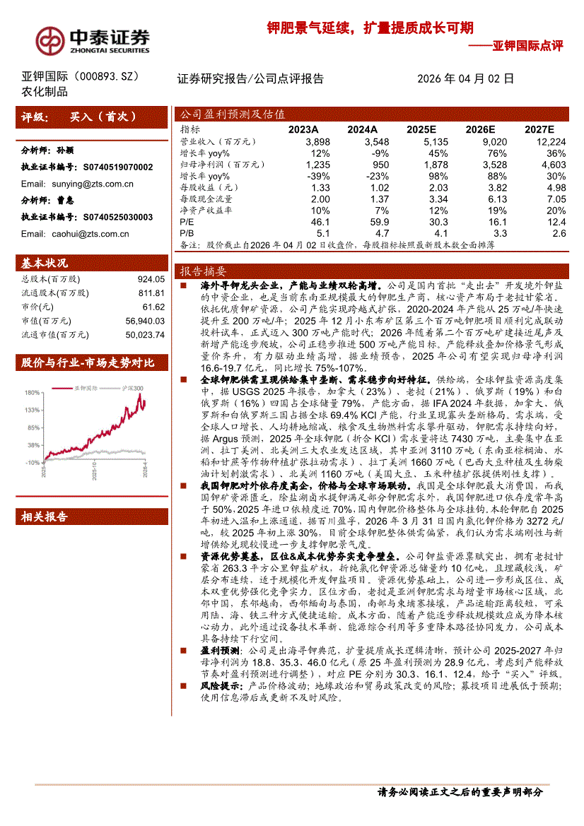 亚钾国际:中泰证券-亚钾国际-000893-点评:钾肥景气延续,扩量提质成长可期-260402