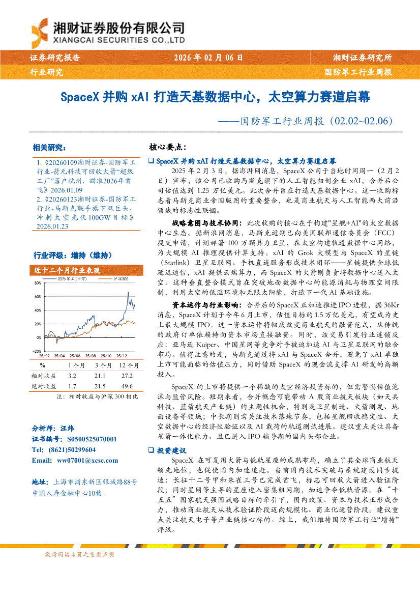 国防军工行业:湘财证券-国防军工行业周报:SpaceX并购xAI打造天基数据中心,太空算力赛道启幕-260206