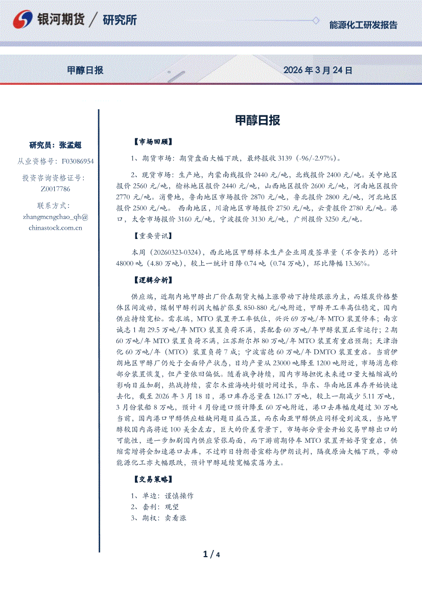 银河期货-中东冲突僵持,甲醇宽幅震荡-260403