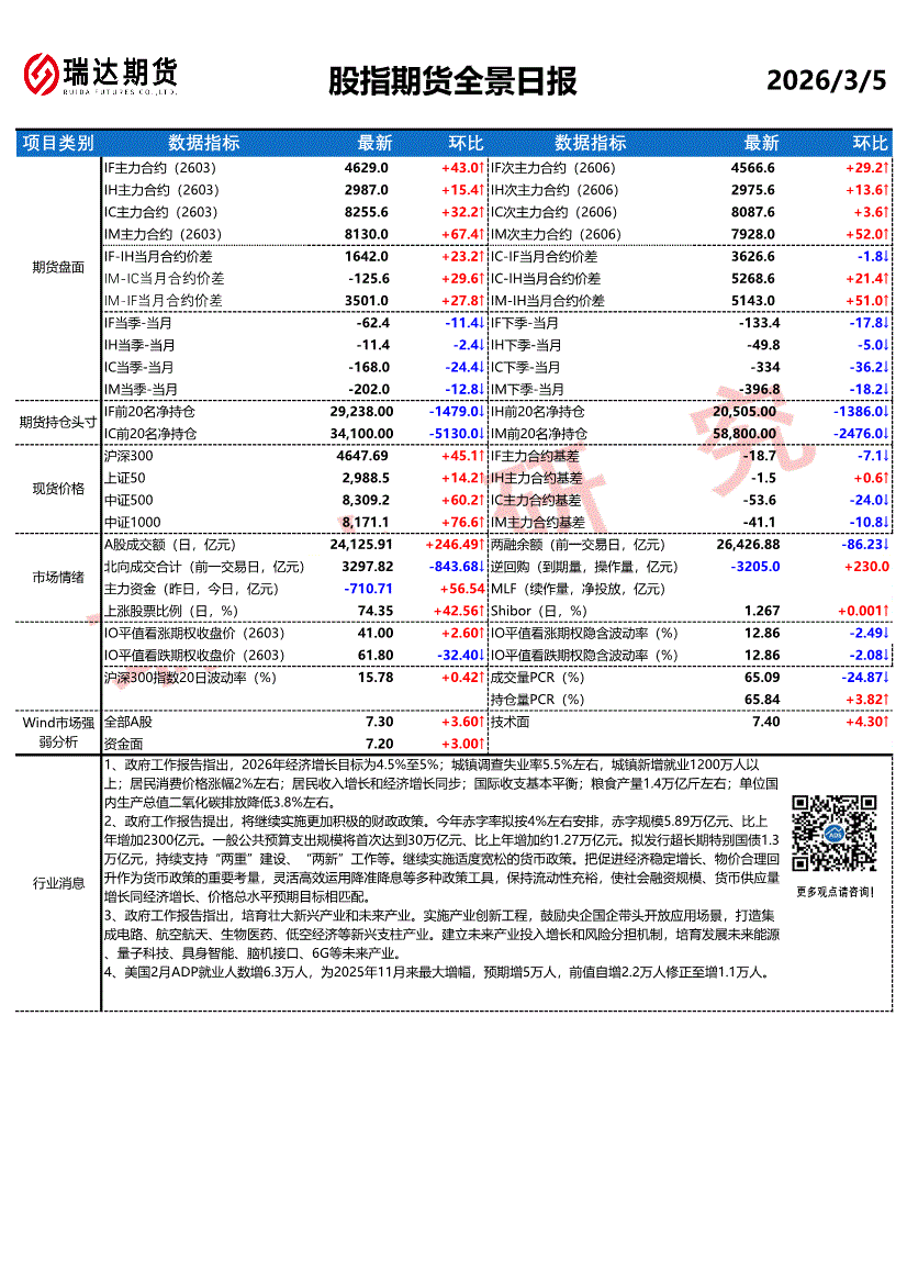 瑞达期货-股指期货全景日报-260305