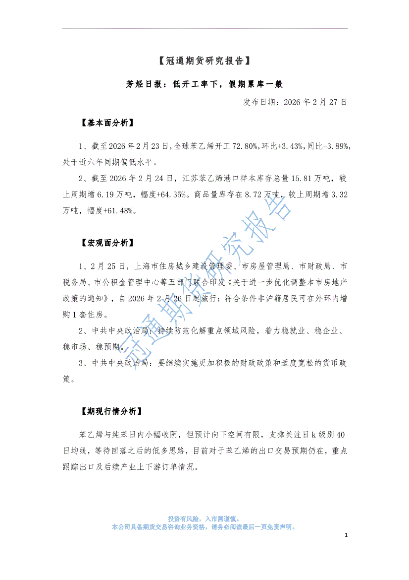 冠通期货-芳烃日报:低开工率下,假期累库一般-260227