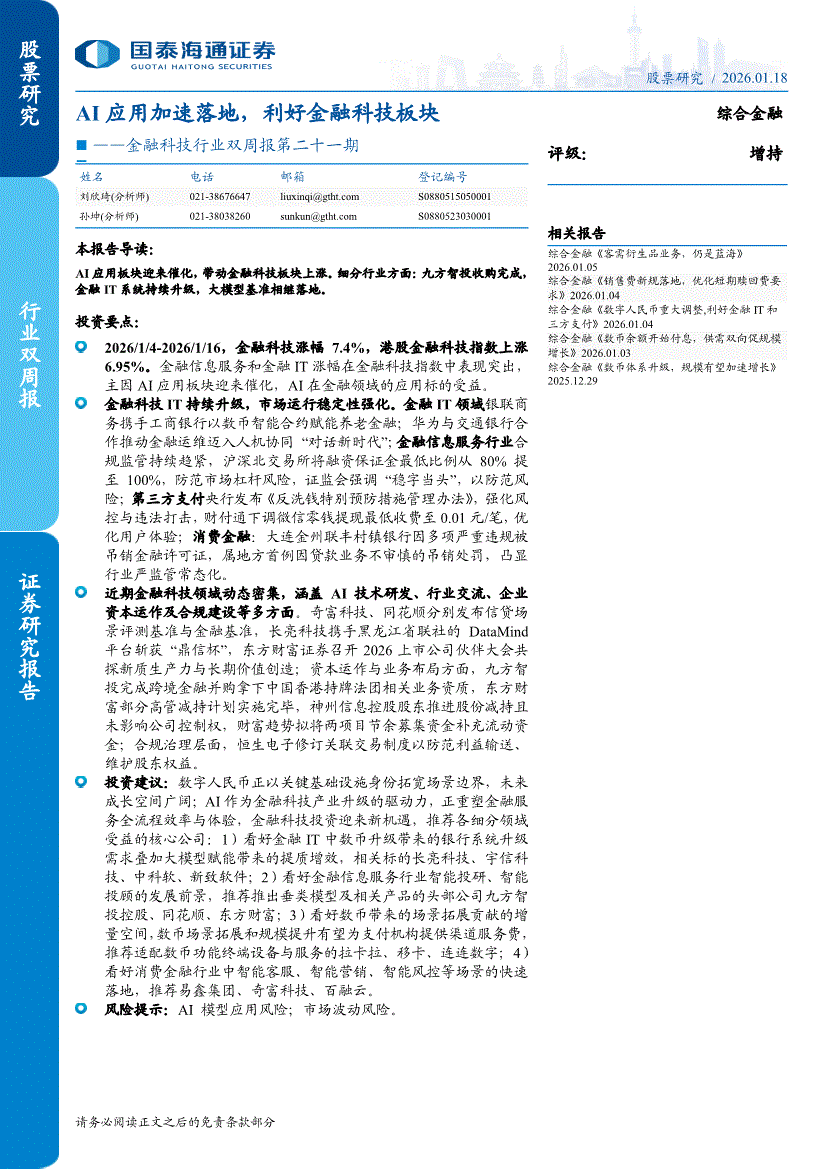 金融科技行业:国泰海通证券-金融科技行业双周报第二十一期:AI应用加速落地,利好金融科技板块-260118