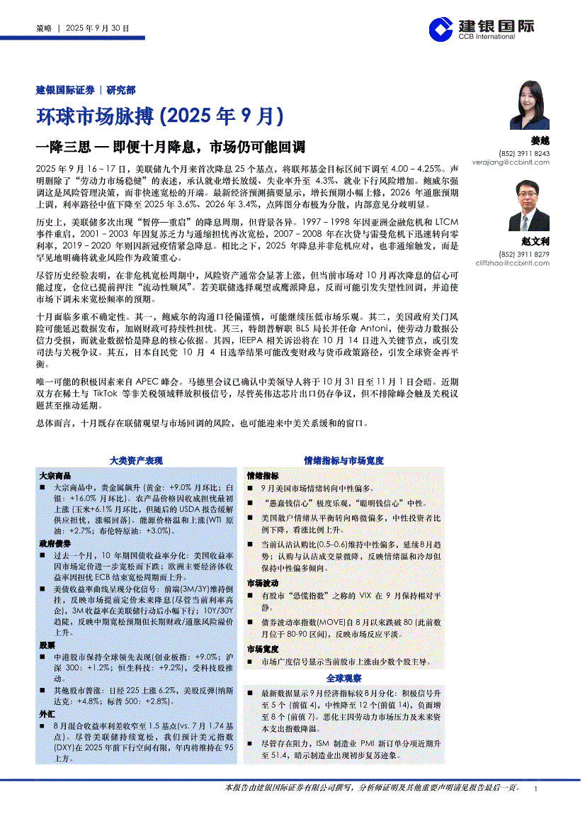 建银国际-环球市场脉搏(2025年9月):一降三思~即便十月降息,市场仍可能回调-250930