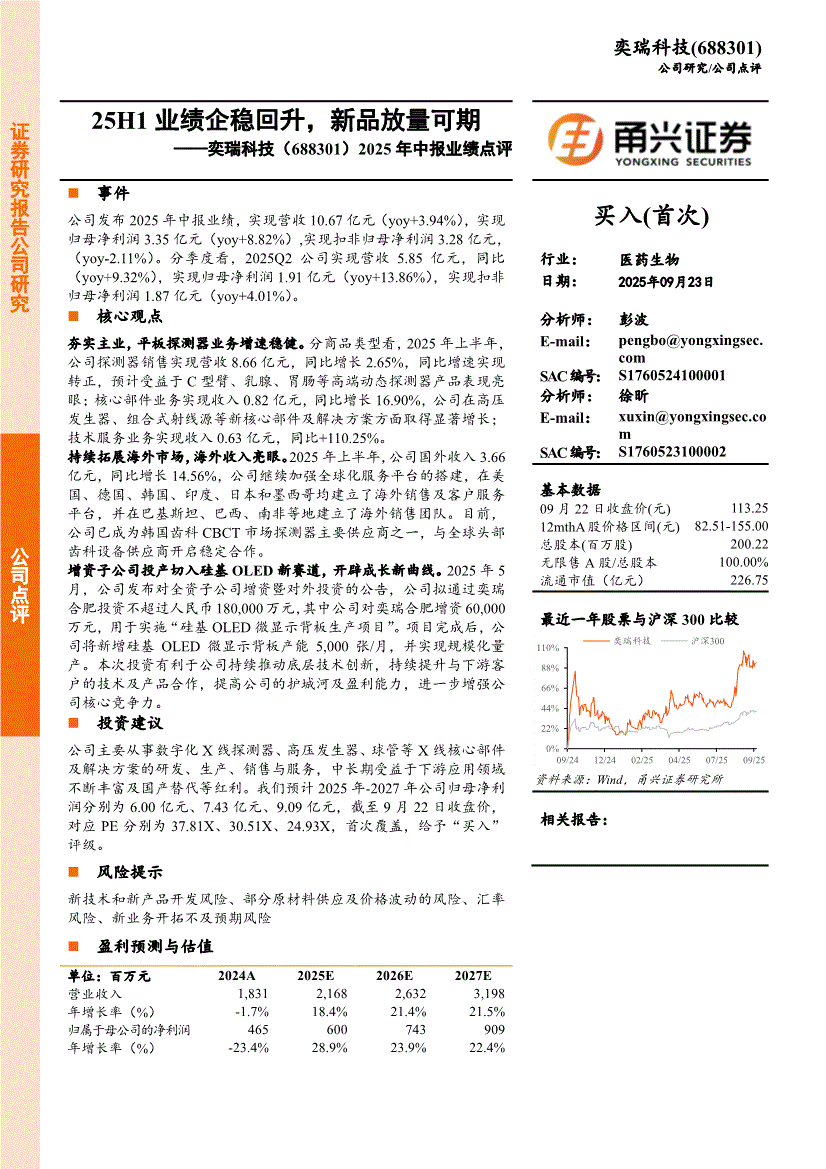 奕瑞科技:甬兴证券-奕瑞科技-688301-2025年中报业绩点评:25H1业绩企稳回升,新品放量可期-250923
