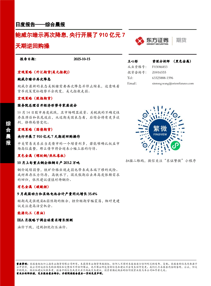东证期货-综合晨报:鲍威尔暗示再次降息,央行开展了910亿元7天期逆回购操-251015