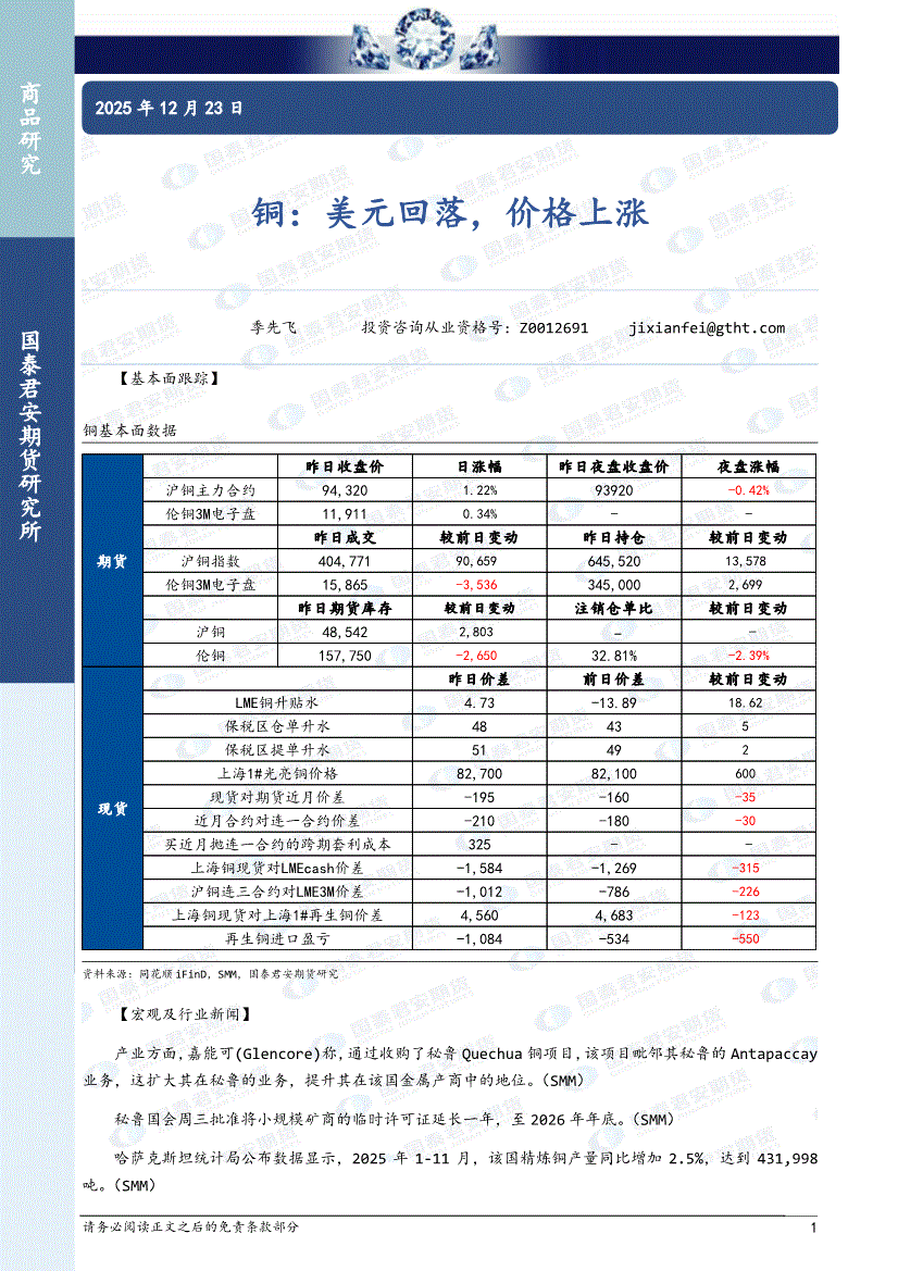 国泰君安期货-铜:美元回落,价格上涨-251223