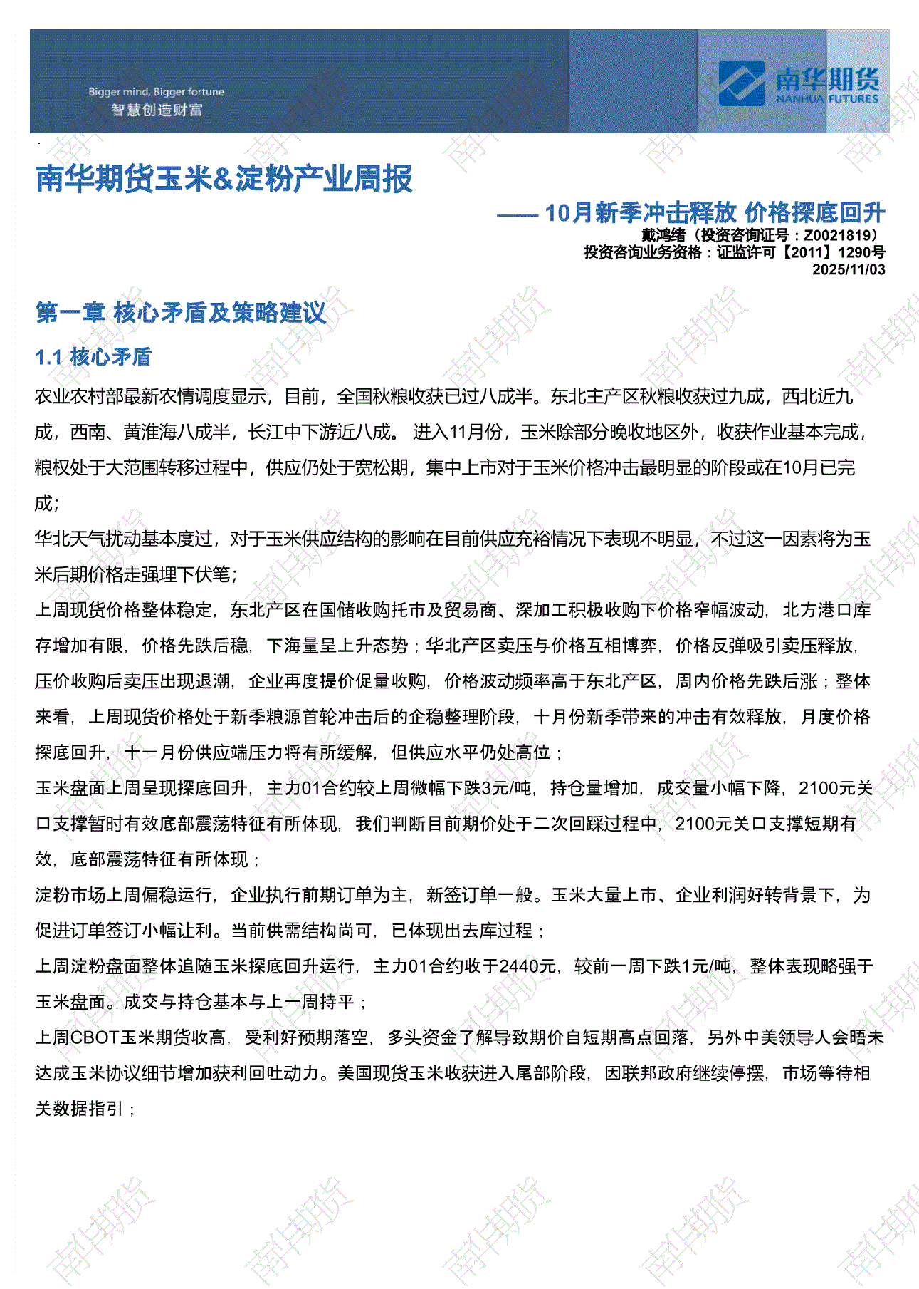 南华期货-玉米&淀粉产业周报:10月新季冲击释放,价格探底回升-251103