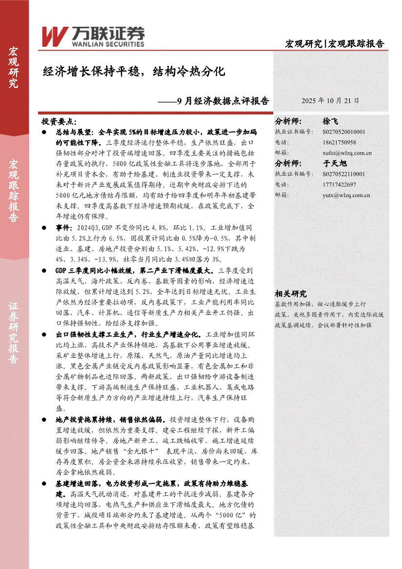 万联证券-9月经济数据点评报告:经济增长保持平稳,结构冷热分化-251021