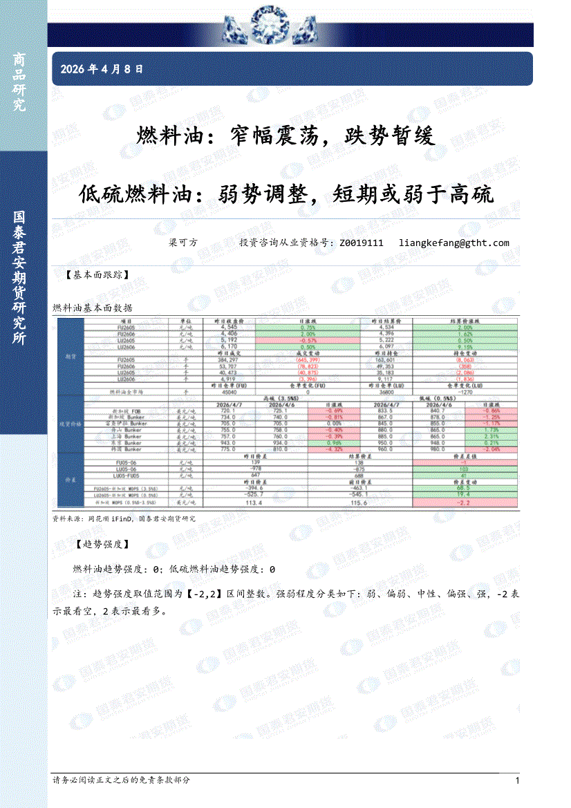 国泰君安期货-燃料油:窄幅震荡,跌势暂缓,低硫燃料油,弱势调整,短期或弱于高硫-260408