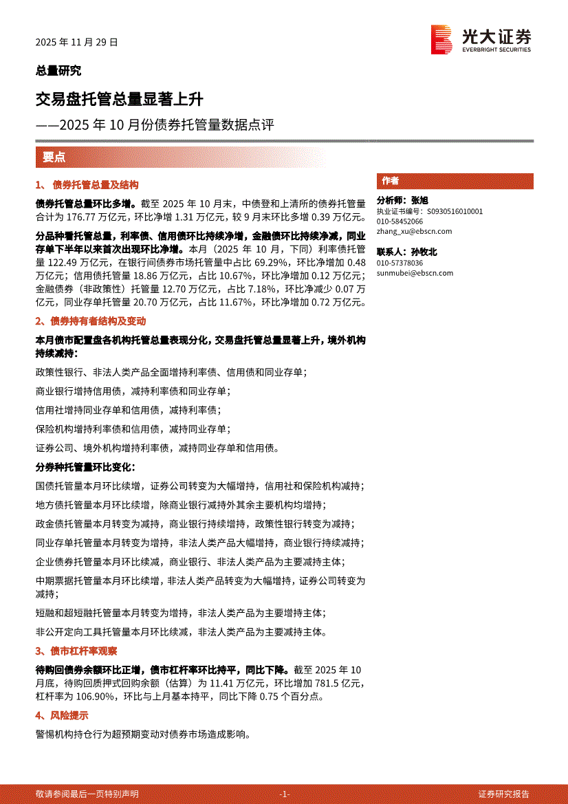 光大证券-2025年10月份债券托管量数据点评:交易盘托管总量显著上升-251129