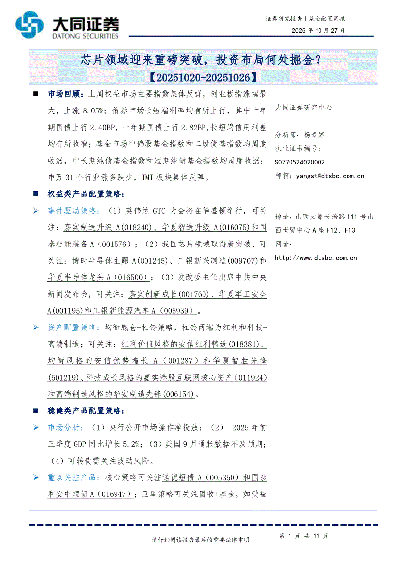 大同证券-基金配置周报:芯片领域迎来重磅突破,投资布局何处掘金?-251027
