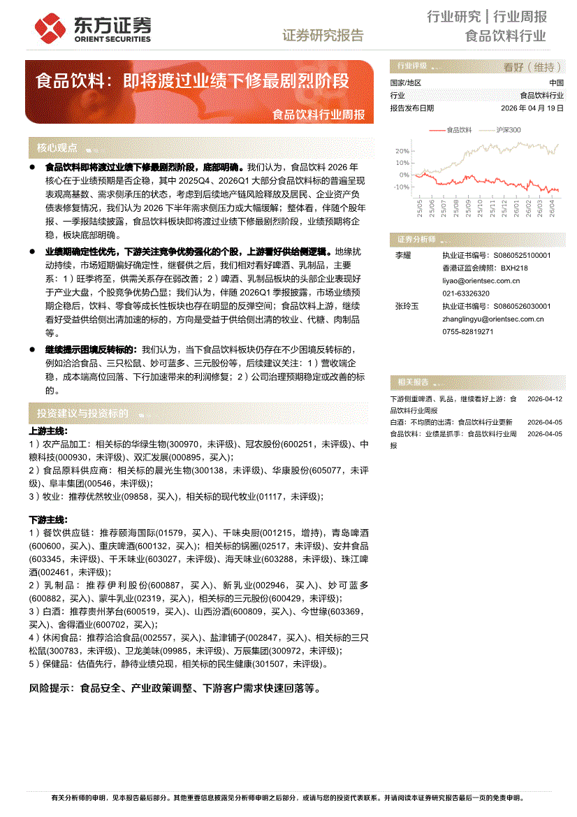 食品饮料行业:东方证券-食品饮料行业周报:食品饮料,即将渡过业绩下修最剧烈阶段-260419