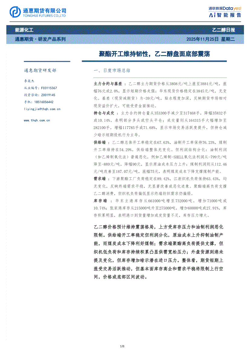 通惠期货-乙二醇日报:聚酯开工维持韧性,乙二醇盘面底部震荡-251125
