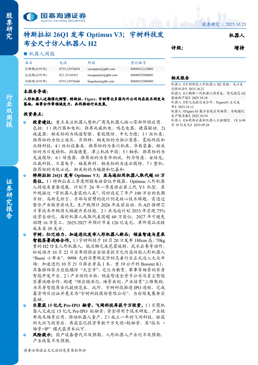 机器人行业:国泰海通证券-机器人行业周报:特斯拉拟26Q1发布Optimus V3;宇树科技发布全尺寸仿人机器人H2-251025